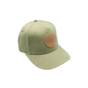 A high crown structured hat with the Hinterland Compass leather patch, and a fabric strap closure.